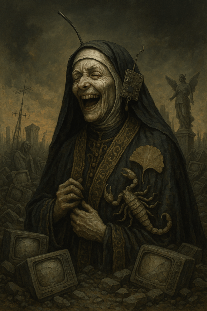Si elles portent la bure, c’est par pure ironie, un déguisement carnavalesque. En vérité, elles ne confessent personne – sauf les machines mortes, qu’elles absoudent en les transformant en fossiles futuribles. Elles ne distribuent pas l’hostie – elles distribuent des fragments de plâtre où gisent des écrans cathodiques.