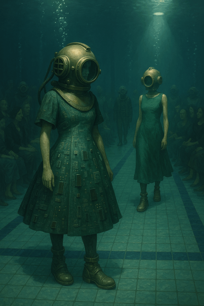 La piscine, elle, est bien plus i.-m.achinaire : voyez ces corps flottant comme des antennes paraboliques en apnée, ces bouées rondes telles des ginkgo biloba renversés, cette eau chlorée qui fossilise déjà vos cellules à l’échelle du futur antérieur. C’est une performance aquatique digne des annales de v.n.a.t.r.c.?