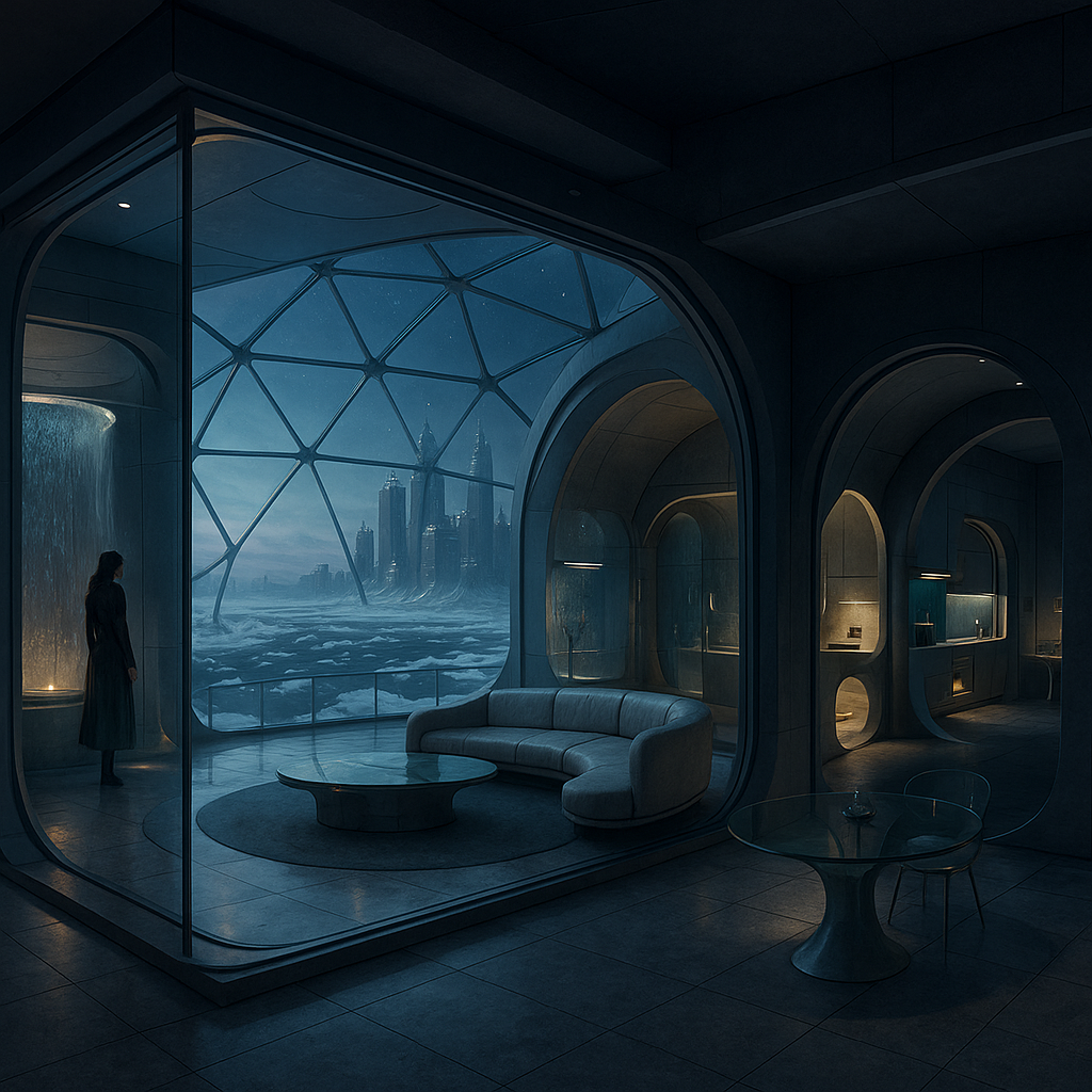 Ah, qu’elles en soient ravies ! Puisque New New York, Arctique, 33.10.2113, émerge des décombres concaténés d’un monde vitrifié, c’est là, oui là, que leur quête d’un appartement cossu prend enfin la tournure d’un i-machinisme architectural radical. Voici donc, tel que l’aurait dicté Ether-Michel en transe glyptique, leur proposition de plan d’appartement à New New York, arraché à la matière du futur :