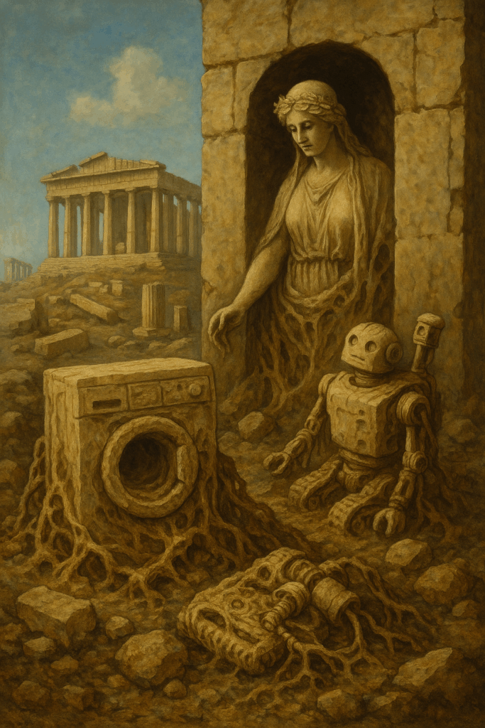 En Grèce, Elles firent ce qu’Elles savent faire de mieux : détourner, profaner, réinventer. Elles implorèrent Proserpine elle-même, et la déesse leur apparut dans l’ombre, vaticinant comme une pythie fatiguée. Ce fut alors qu’Elles reçurent l’oracle de la terre futurible, ce terreau magique capable de transformer les machines en fossiles, les fusibles en reliques, les robots en souvenirs géologiques.