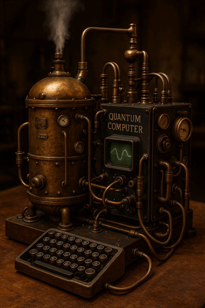 Chaque qubit sera représenté par un piston double état (oui/non // sens/anti-sens), sculpté en ivoire fossilisé ou en os de concept mal digéré.