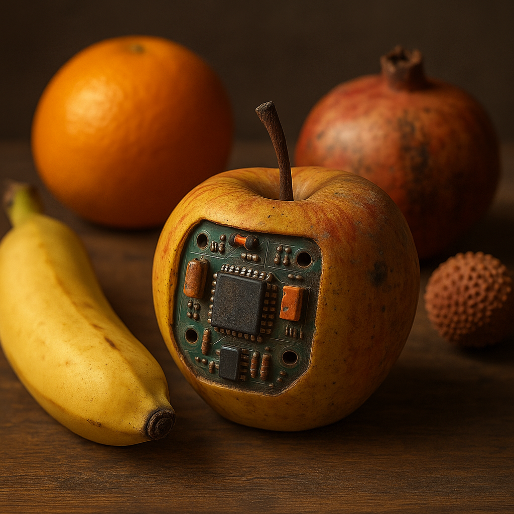 Mais si, par pur plaisir parodique, elles daignaient mordre dans un fruit, elles choisiraient le fruit impossible, celui qui n’est ni sucré, ni mûr, ni reconnaissable — un fruit fossilé, fruit i.-machinal, issu d’un verger radioactif, ou mieux : fruit conceptuel, sculpté dans du plâtre et constellé de circuits obsolètes.