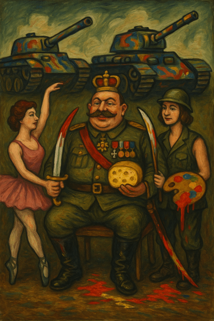 Bref, leur pacte militaro-artistique fut une mascarade sublime : la seule guerre où l’arme ultime fut la minauderie, et où la victoire consistait à transformer chaque défaite en tableau grotesque.