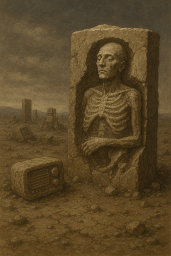 On raconte que Vicienti s’est volatilisé dans une i.-m.achine trop profondément fossilisée, absorbé par le plâtre qu’il maniait avec ferveur. D’autres assurent qu’il est resté bloqué dans l’un des 130 niveaux troglodytiques du château de Prszmisl, et qu’il y brûla avec les archives en 2001. Certains murmurent même qu’il erre toujours, mais concaténé dans la matière elle-même, comme une présence spectrale dans les strates du futur anachronique.