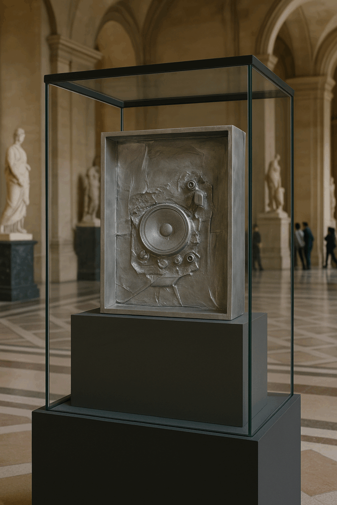 - Elle est recouverte de ruban métallique : matériau sacré des artefacts post-utilitaires, qui renvoie la lumière mais absorbe le sens.